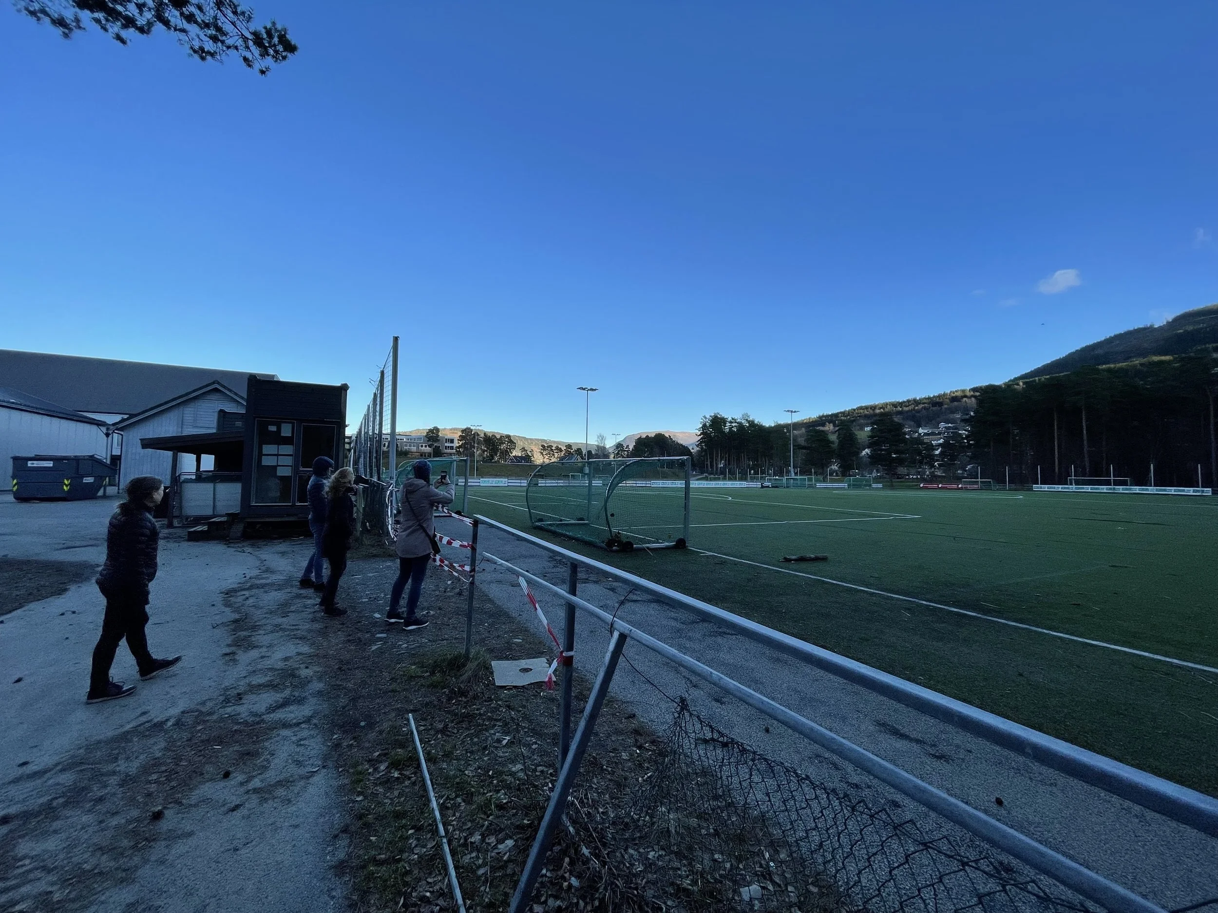 Kunstgrasbanene i sentrum vart øydelagde både i 2014 og i 2022. Ei av gruppene på Klimathon undersøkte korleis ein kunne bygge banene slik at dei toler å hamne under vatn. (Foto: Idun A. Husabø)