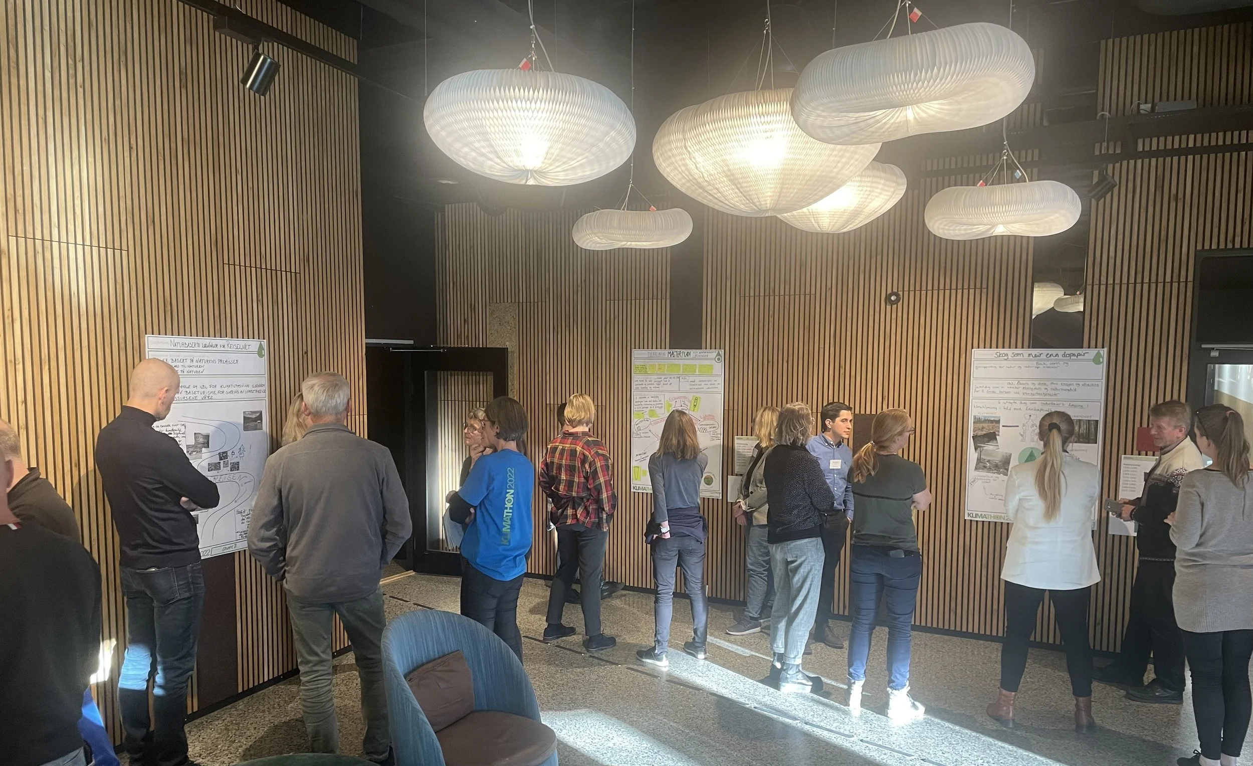 Plakatutstillinga var sjølve finalen i Klimathon2022 og drog i gang mange interessante diskusjonar. (Foto: Lene Omdahl)